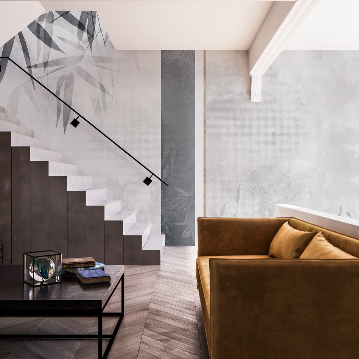Die Einführung einer modernen Tapete hat diese Treppe von einem einfachen architektonischen Übergang in ein zeitgenössisches Kunstwerk verwandelt. Die Wahl eines Natur-Designs mit stilisierten Blättern, die sich vor dem Profil eines fernen Mondes abzeichnen, lädt zu einer neuen visuellen Erfahrung ein.
