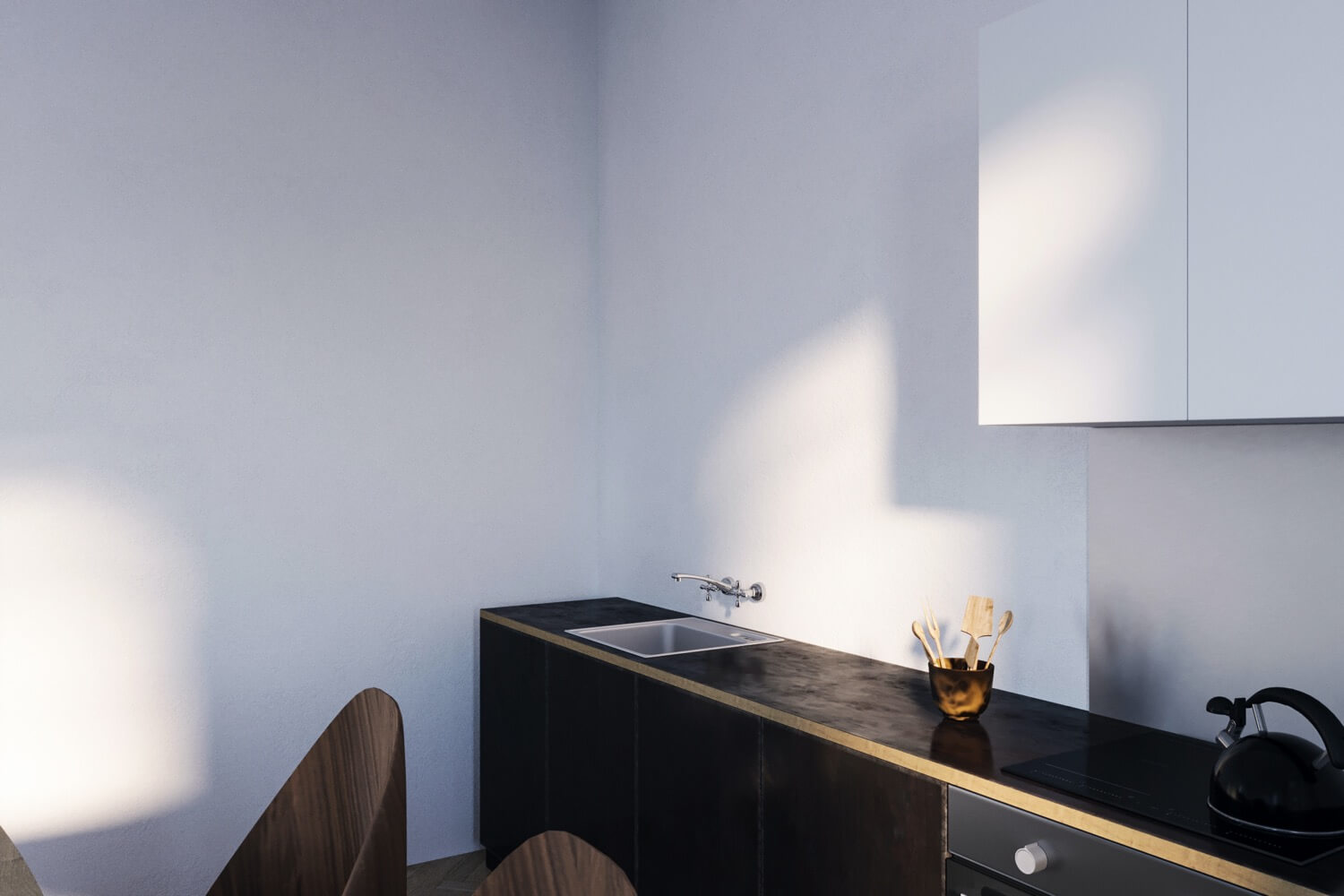 Für dieses Konzept haben wir uns einen besonderen Küchenraum vorgestellt, der frei an der Wand ist, die traditionell für Oberschränke vorgesehen ist, um eine adrette und weitreichende Lösung anzubieten.