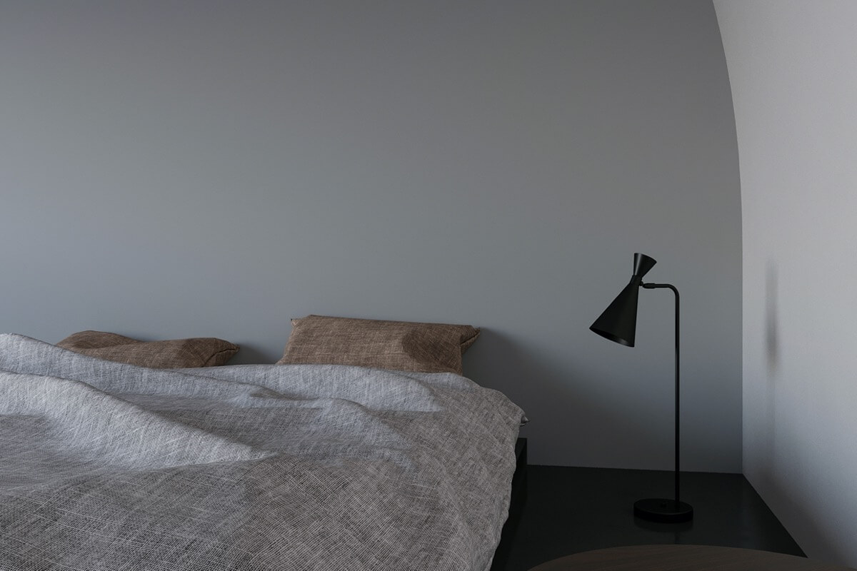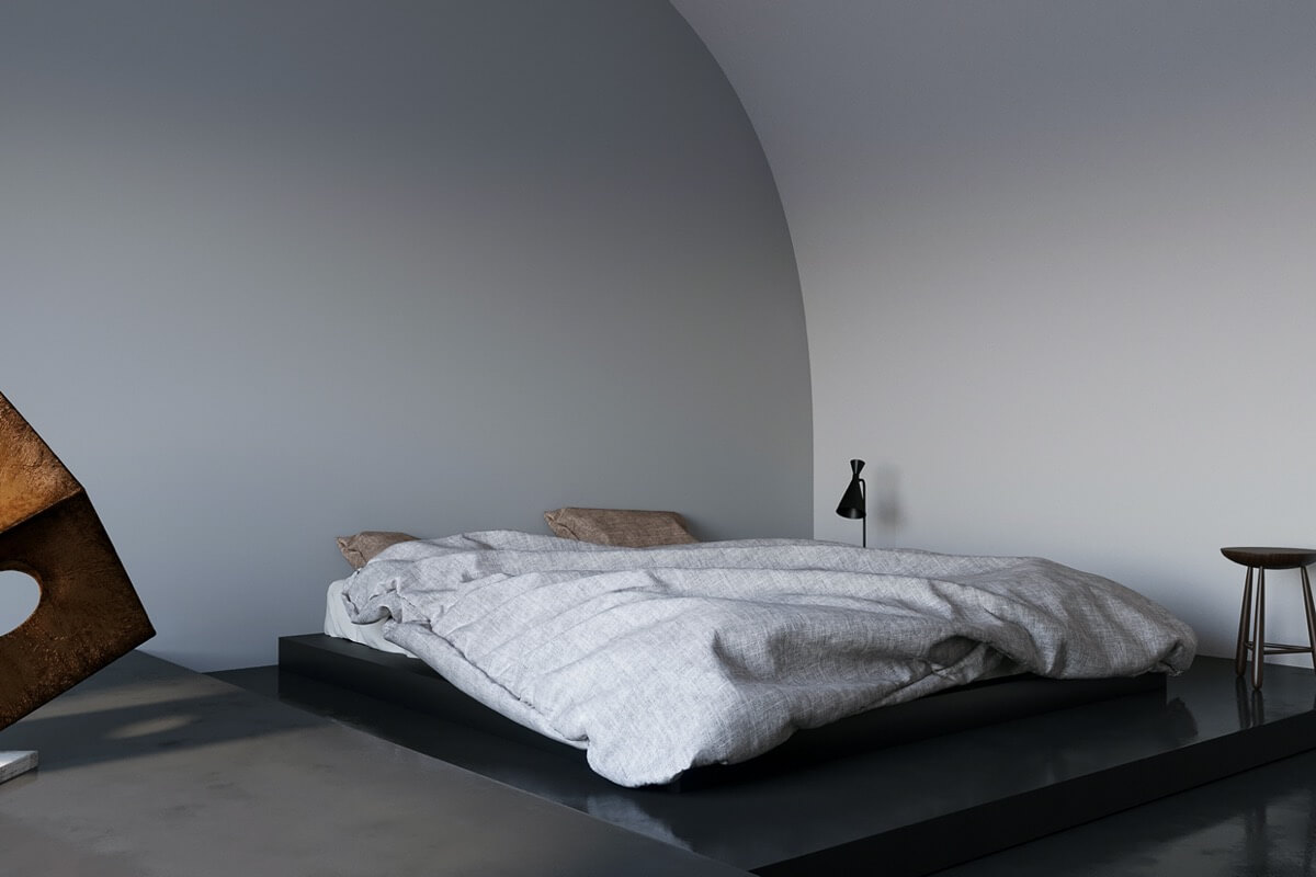 Wir dachten an ein spezielles Konzept: ein modernes Zimmer mit einem Bett im japanischen Stil und einem kleinen Fußteil, einem großen Fenster, das für natürliches Licht sorgt, und wenigen, aber raffinierten Möbelstücken.